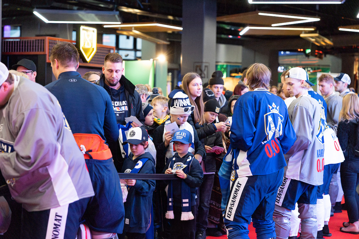 Harjoitusten jälkeen Suomen maajoukkueen pelaajat jakavat nimmareita Nokia Arenan aulassa. Ensimmäisiä pelaajia voi odottaa paikalle jo heti klo 14 jälkeen.