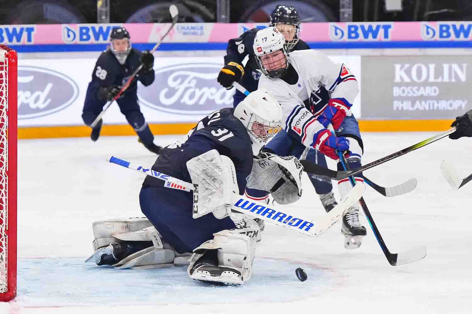 USA:n Kassidy Carmichael ahdisteli Suomen Kerttu Kuja-Halkolan vartioimaa maalia. Kuva: Andre Ringuette/IIHF