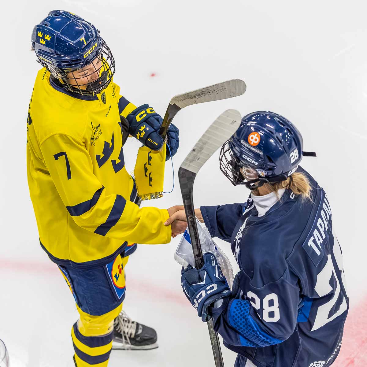 Kapteenit kättelivät ja vaihtoivat viirit ottelun alussa. Oikealla Tinja Tapani, vasemmalla Ebba Westerlind.