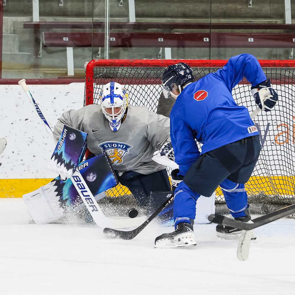 Maalivahti Patrik Kerkola vilvoitteli Nuorten Leijonien lauantain harjoituksissa. Kuva: Pasi Mennander