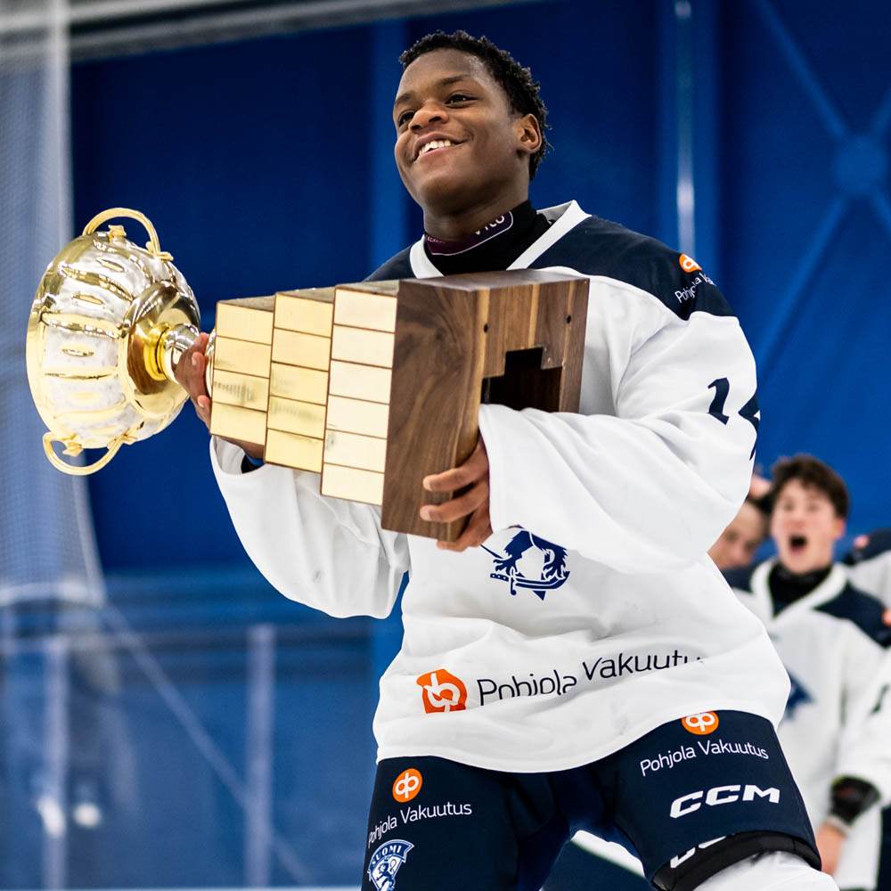 Niilo Jokinen juhli finaalin jälkeen Pohjola-maljan kanssa. Kuva: Riku Laukkanen