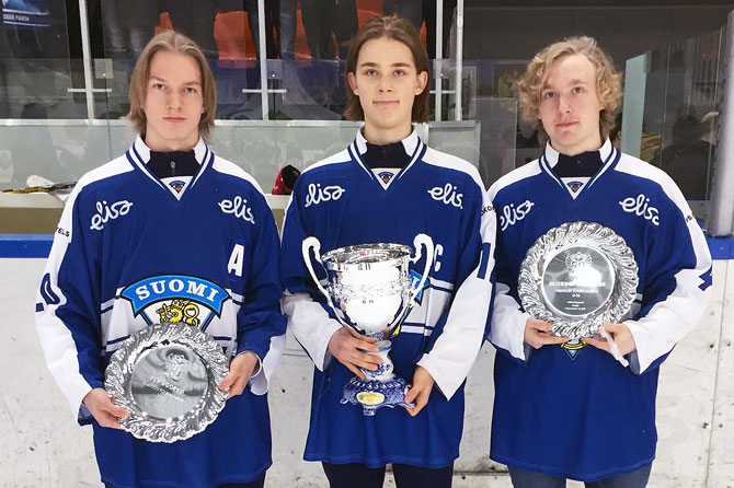 Leijona-pelaajia palkintoineen: MVP Anton Lundell (vas.), turnauksen kakkospokaalin vastaanottanut kapteeni Henri Nikkanen ja turnauksen paras puolustaja Iivari Räsänen.