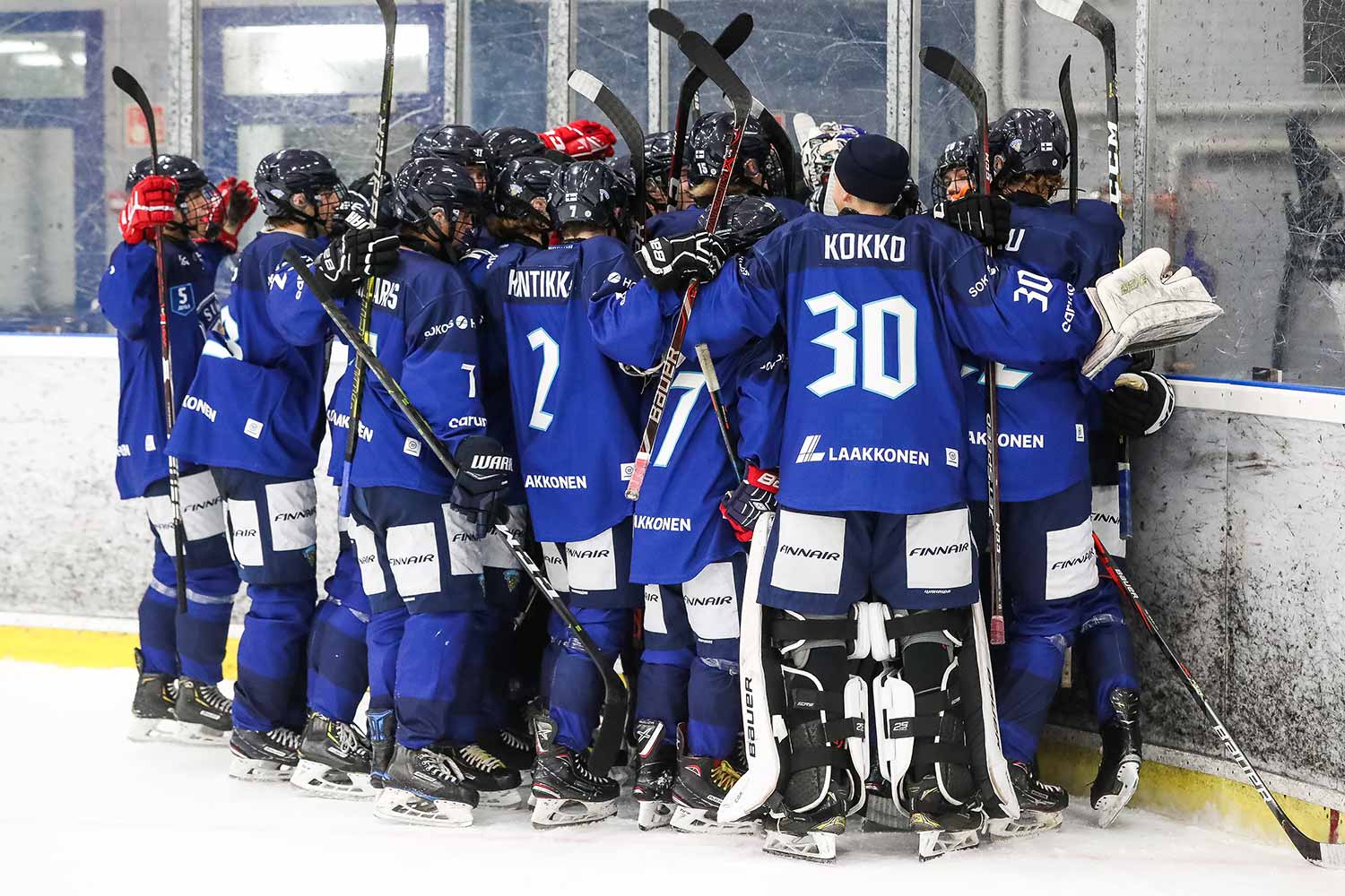 Suomen joukkueen juhlaa ensimmäisen voitetun Tshekki-pelin jäljkeen.