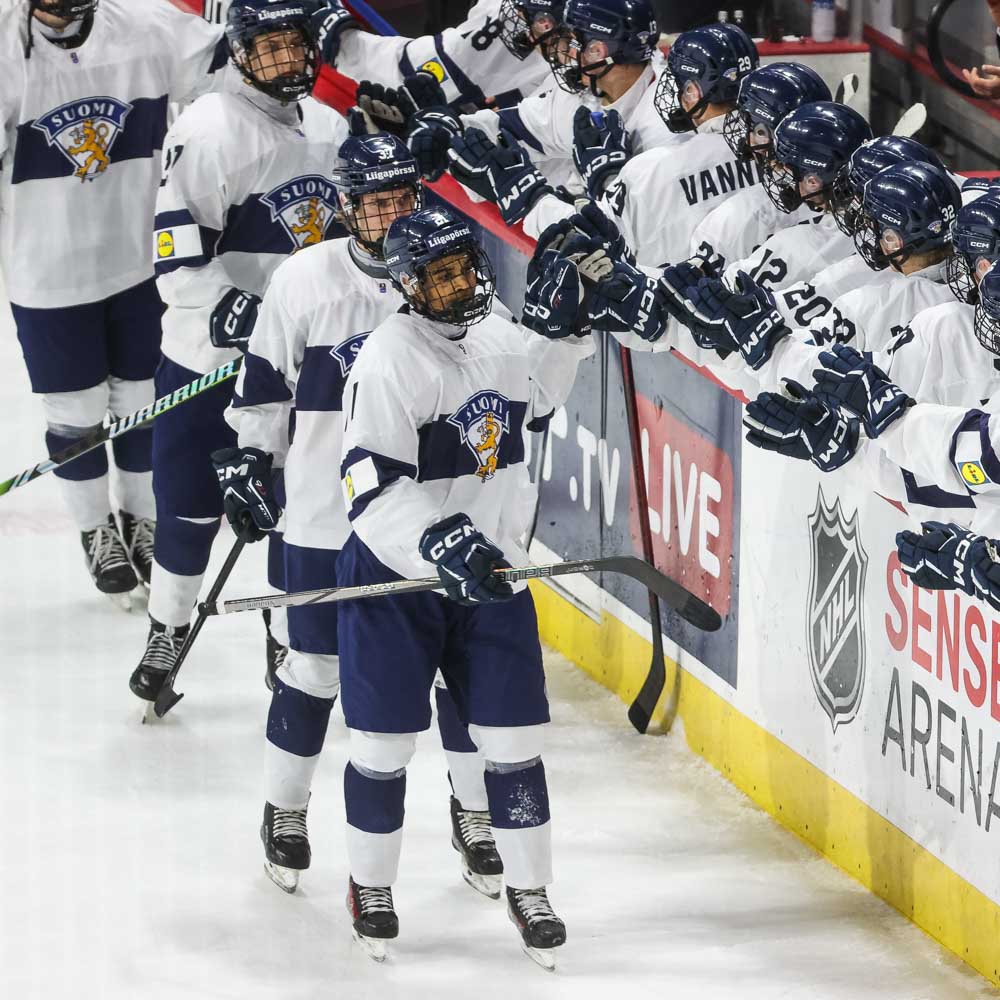 Maalivahti Jooa Sammalniemi vastaanotti onnitteluja vuoden 2025 voitokkaan Latvia-ottelun jälkeen. Kuva: Pasi Mennander