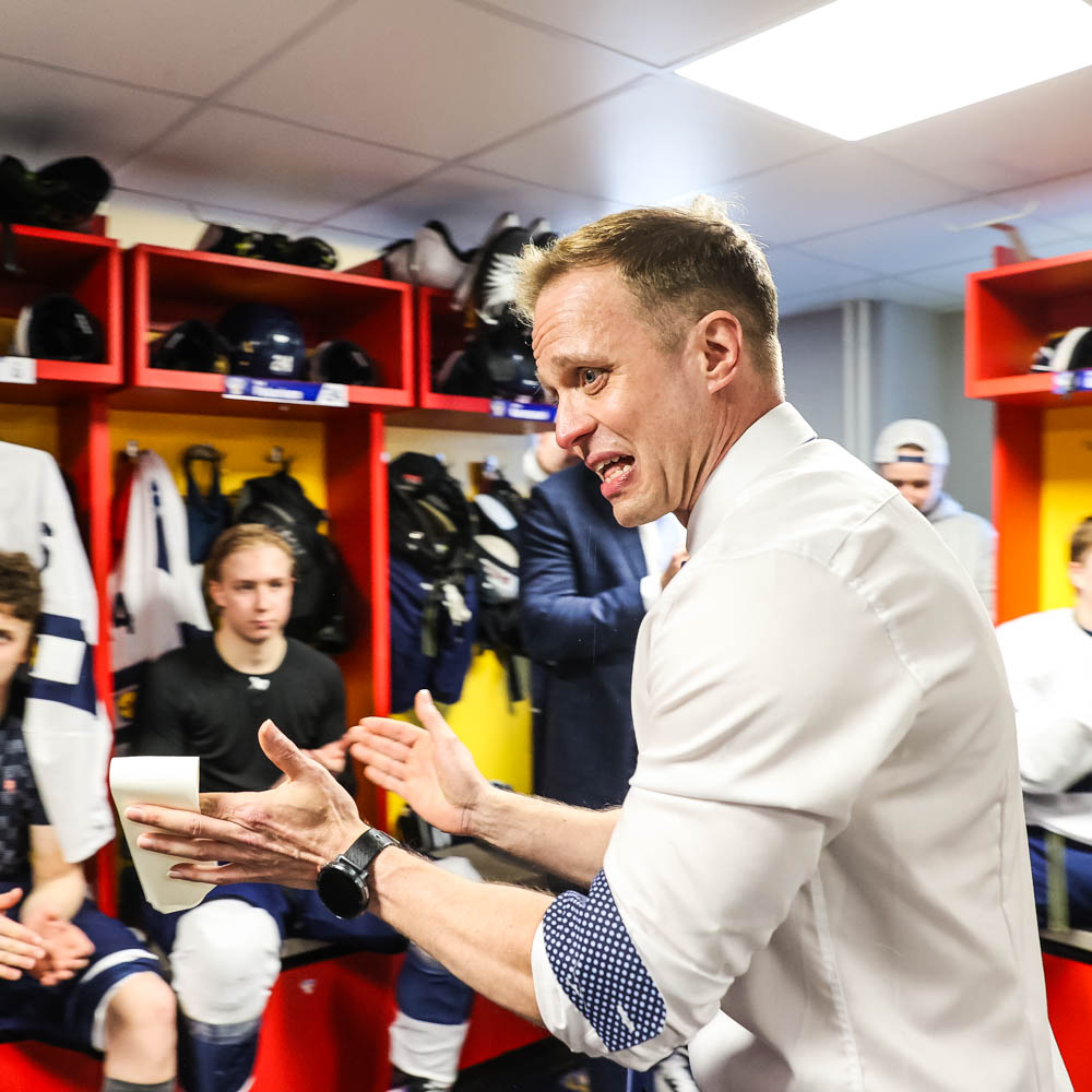 Videolla Pikkuleijonien päävalmentaja Tuomo Ropo puhuu joukkueelleen voitokkaan Norja-ottelun jälkeen.