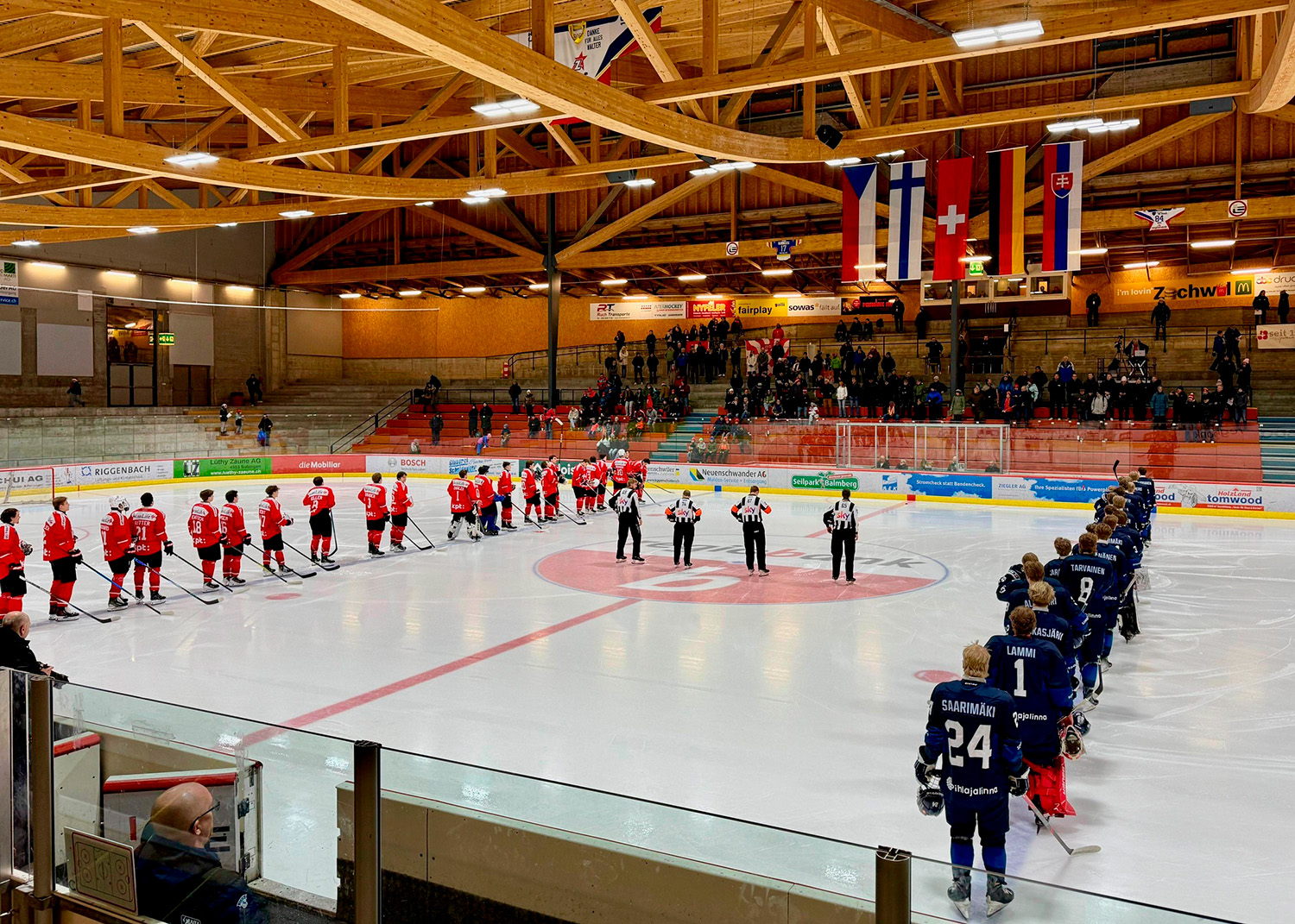 Maanantain iltaottelussa Sveitsin maaliverkkoja heiluttelivat kaksi maalia viimeistellyt Ilari Mäkinen sekä Max Järventie ja Atte Vuori. Suomen maalilla Pyry Lammi venyi kiekon eteen 22 kertaa.
