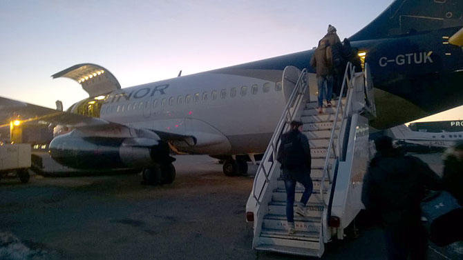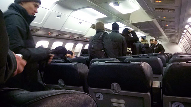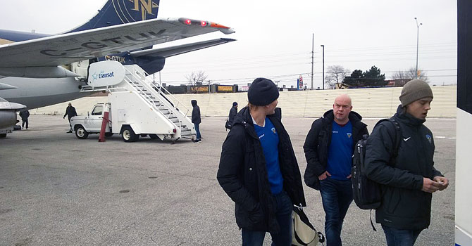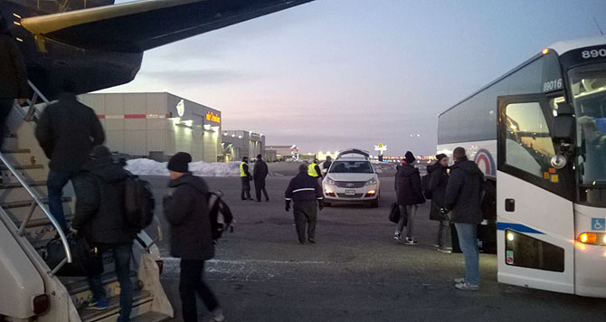 Bussi kaarsi ”änärityyliin” suoraan lentokoneen viereen. Samalla koneella Montrealista Torontoon reissasi Saksan joukkue, jota vastaan Suomi pelasi alkusarjan päätöspelinsä keskiviikkona. Saksa pelaa Torontossa karsintapelejä, Suomi valmistautuu perjantain puolivälieräotteluun.