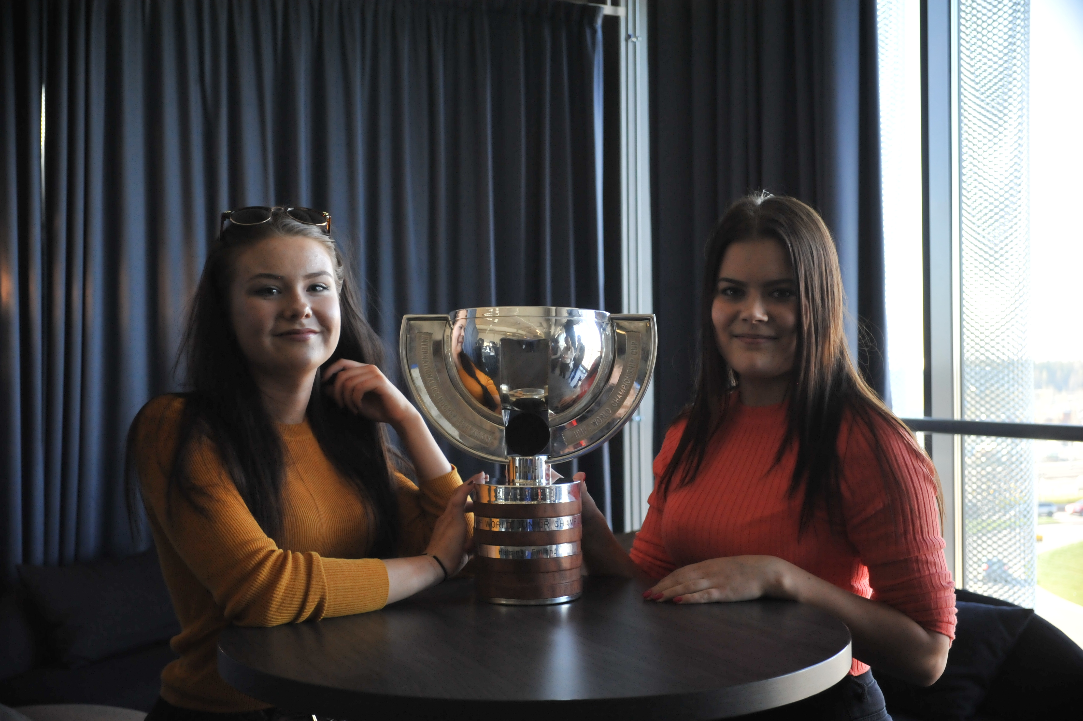 Tea ja Noora työskentelivät nuorten MM-kisoissa akkreditointipisteessä.