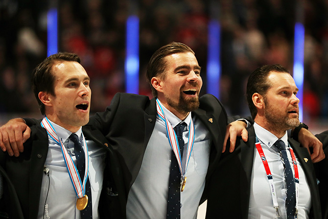 Maamme! Vasemmalta Tuomo Ruutu, Jussi Ahokas ja joukkueenjohtaja Markus Lindström.