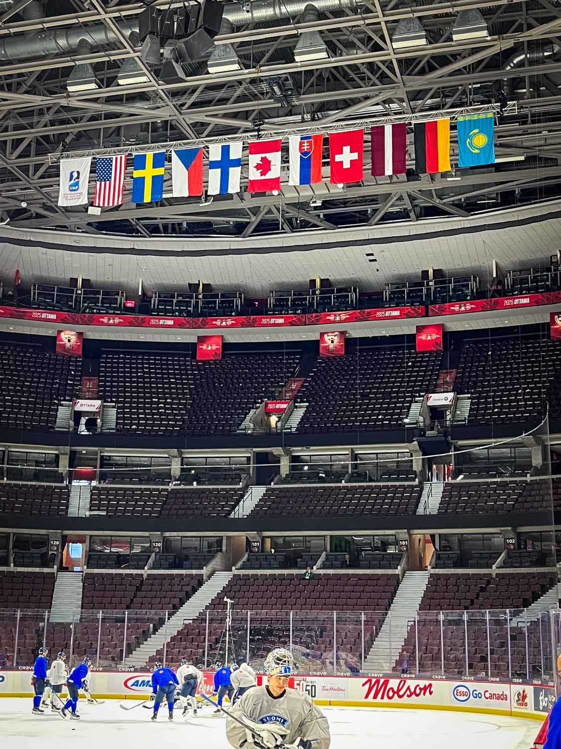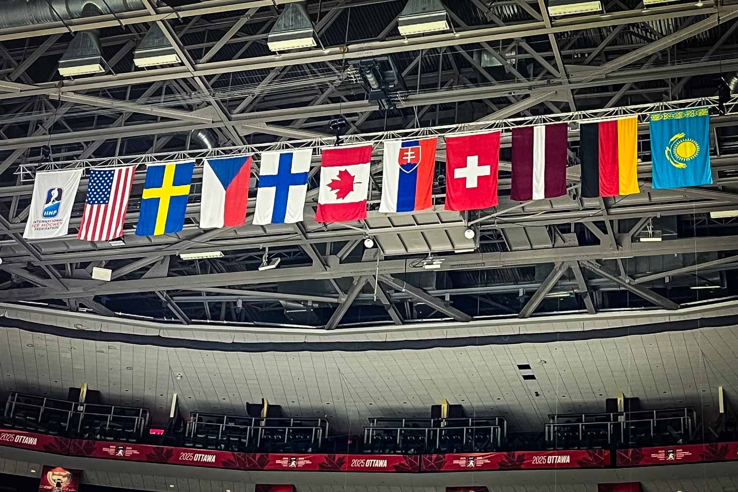Canadian Tire Centren kattoon nostetut MM-kisojen osallistujamaiden liput viestivät vuosi sitten pelatun turnauksen loppujärjestyksen.