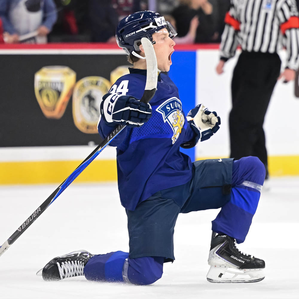 Juhlat käyntiin! Vasemmalla Julius Miettinen, keskellä voittomaalin tekijä Arttu Välilä ja oikealla Matias Vanhanen. Kuva: Micheline Veluvolu/IIHF