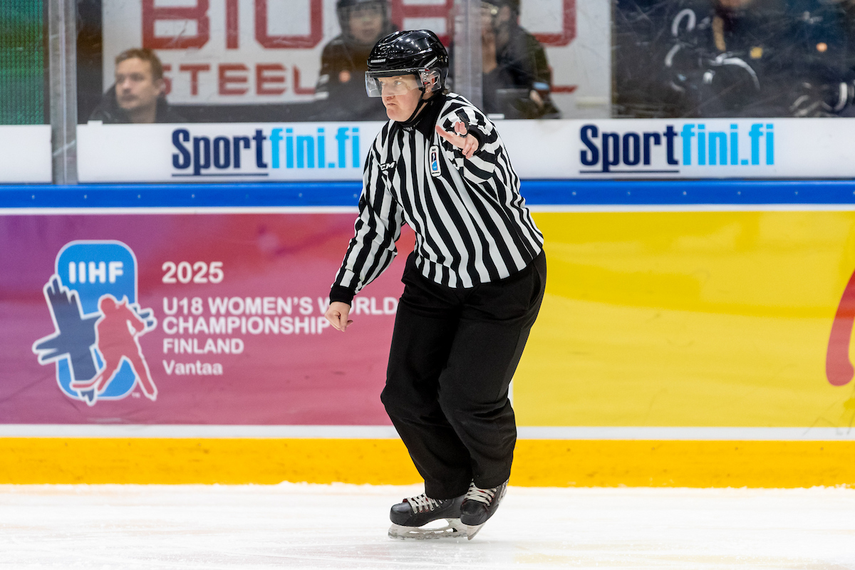 Salla Raitala viheltämässä WEHT-turnauksessa joulukuussa 2024 Suomen ja Kanadan välisessä ottelussa Tampereella. Kuva: Jari Mäki-Kuutti