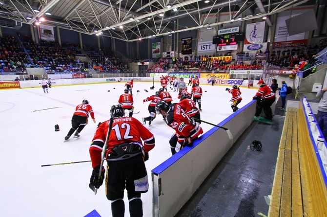Mestaruusjoukkue, pokaali ja joensuulaiskannattajat. Mehtimäen jäähallissa oli lähes 2 800 katsojaa.