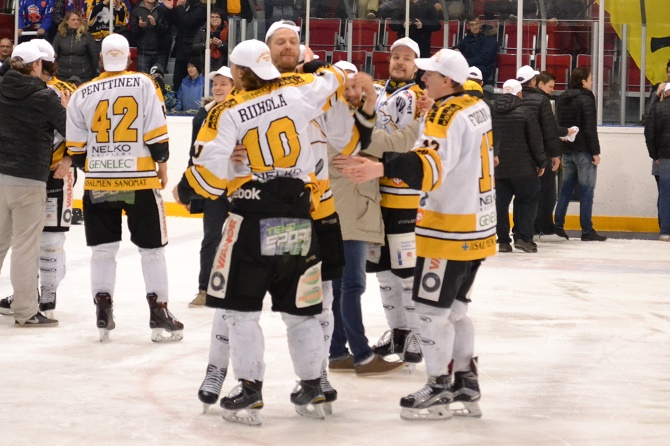 Voittomaalin tehnyt Joni Riihola juhlinnan keskipisteenä.