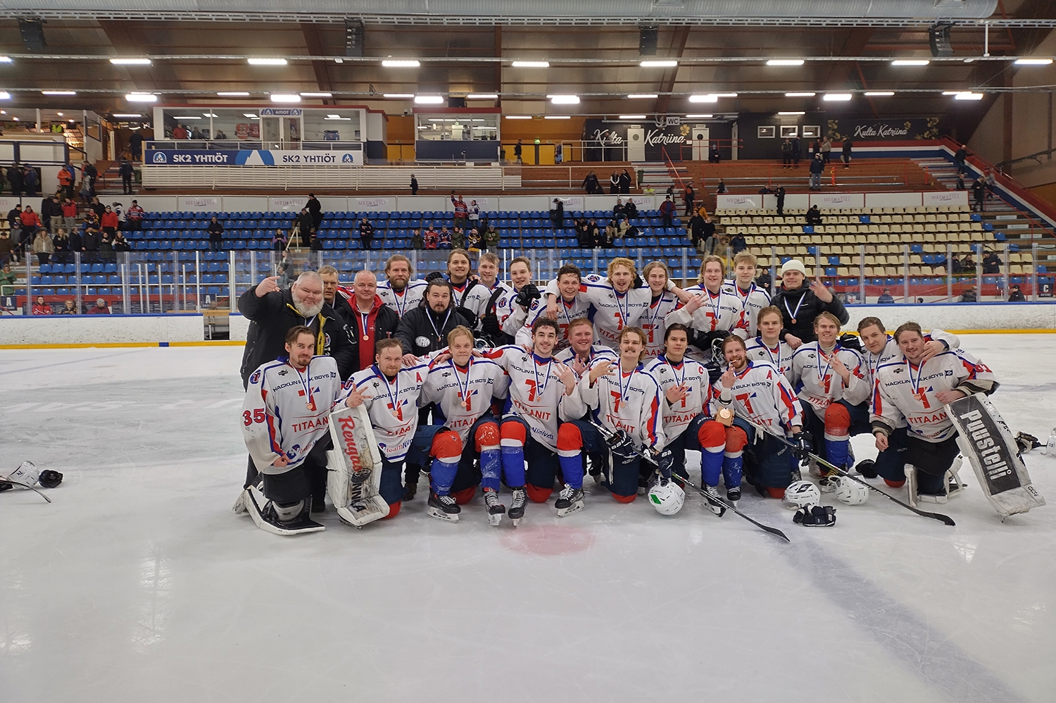 Kotkan Titaanit juhlii Suomi-sarjan pronssia kaudella 2023–2024. Joukkue voitti pronssiottelussa SaPKon maalein 3–2. Tasaisen ottelun ratkaisu nähtiin vasta jatkoajalla kun Titaanien Ilmari Karhapää onnistui iskemään kiekon savonlinnalaismaalivahdin Juho Ahopellon selän taakse ajassa 69.21. Voittomaali oli Karhapään ottelun toinen osuma, ensimmäisen kotkalaismaalin pelissä teki Rene Hiekkataipale. SaPKon maaleista vastasivat Karri Kapanen sekä Jesse Pesonen. Ahopellolle kertyi SaPKon maalilla yhteensä 36 torjuntaa, Titaanien Niilo Pussiselle torjuntoja kertyi 38.