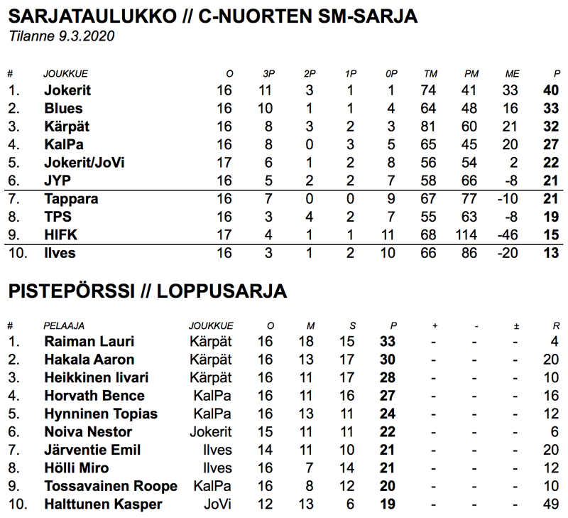 C-nuorten SM-sarjassa palattiin tauolta viikonloppuna. Jokerit varmisti runkosarjan voiton. Viikonlopun maalitykkinä vakuutti Ilveksen Emil Järventie.