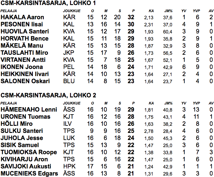Karsintalohkossa 1 pistepörssin kärjessä on Kärppien Aaron Hakala. Keskushyökkääjä on koonnut syyskaudella pisteitä tasaisesti ja jäänyt vain kerran pisteittä. Syyskuun alussa Hakala kokosi KooKoota vastaan saldon 2+3. Hän johtaa myös lohkon syöttöpörssiä ja on vertailun ykköspelaaja tasakentällisin.