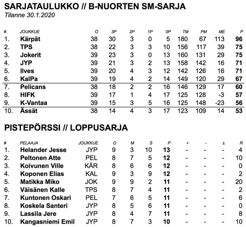 JYP oli tiistaina voitokas kotonaan Pelicansia vastaan. Erikoistilanteet olivat tärkeässä roolissa 13 maalin talkoissa: JYP osui ylivoimalla peräti neljästi ja lopussa kahdesti tyhjään maaliin. Jere Lassila osui ottelussa kahdesti ja vastasi JYPin voittomaalista päätöserässä. U16-maajoukkueessa tehokkaasti esiintynyt Lassila on koonnut B-nuorissa tällä kaudella 38 pistettä 35 ottelussa.