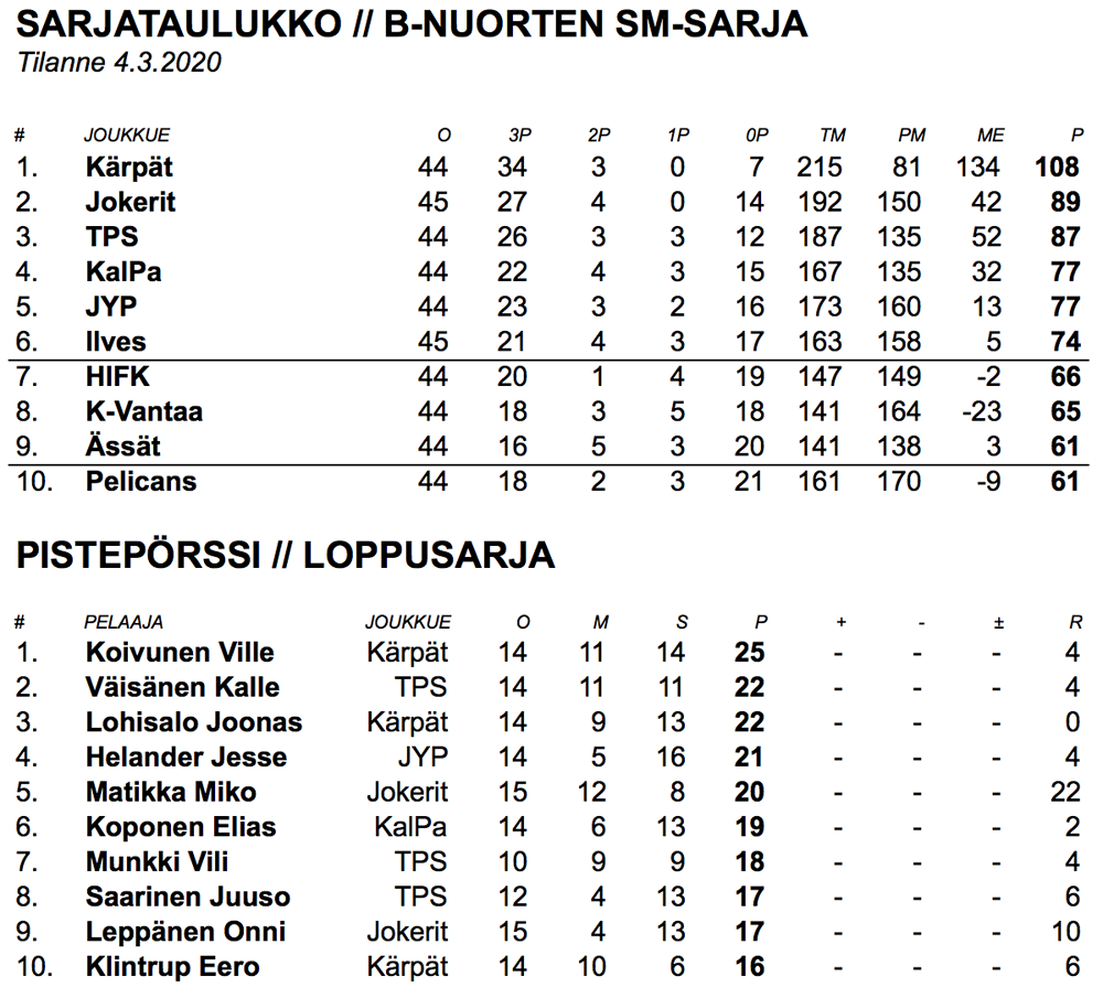 B-nuorten SM-sarjan loppuhuipennus on edessä. Kärpät marssii runkosarjan voittoon, mutta viimeisillä kierroksilla riittää vielä panoksia muista pudoptuspelipaikoista. Runkosarjan viimeinen kierros pelataan sunnuntaina 15. maaliskuuta.