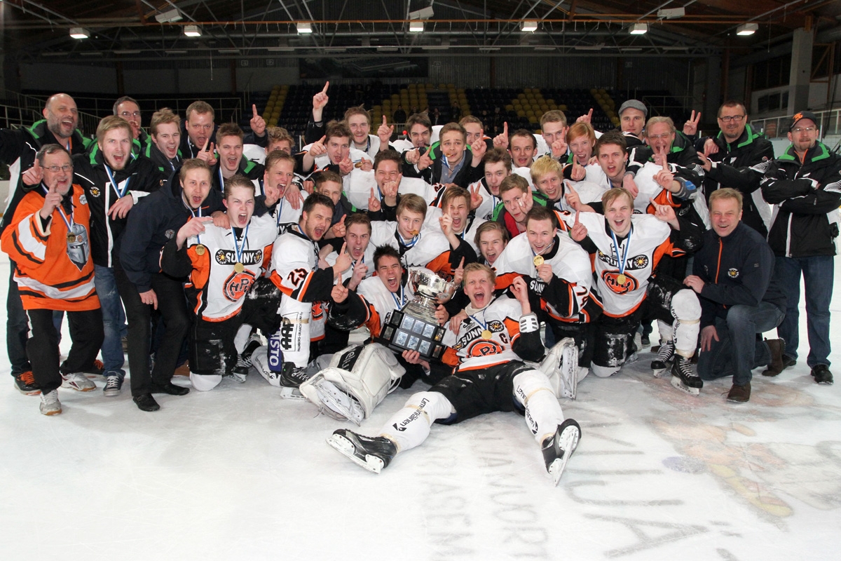 Nuorten SM-liigan kauden 2012-13 voittajajoukkue HPK asettui perinteiseen mestaruuskuvaan Matinkylän jäähallissa 1.4.2013.