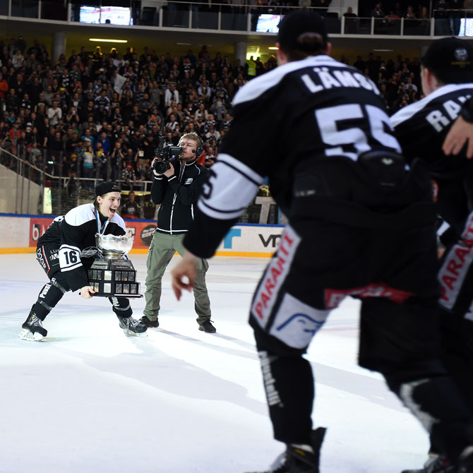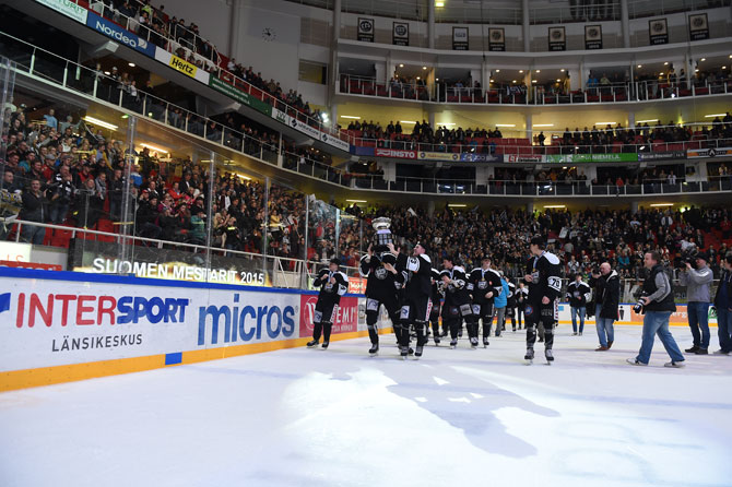 Tästä käynnistyivät juhlat - kapteeni Jani Karelius liukui Legacy Bowl sylissään joukkueensa luo.