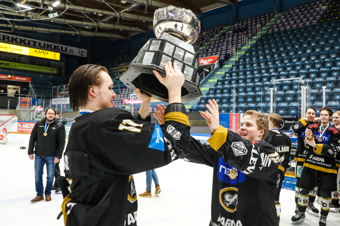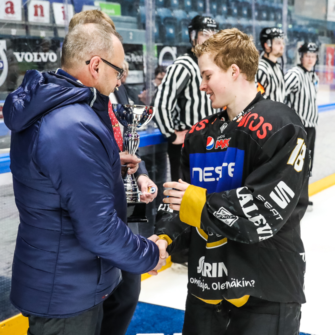 Ville Peltosen nimeä kantavan Nuorten SM-liigan pudotuspelien arvokkaimman pelaajan palkinnon vastaanotti torstain ratkaisevan finaaliottelun jälkeen Kärppien hyökkääjä Ville Heikkala.