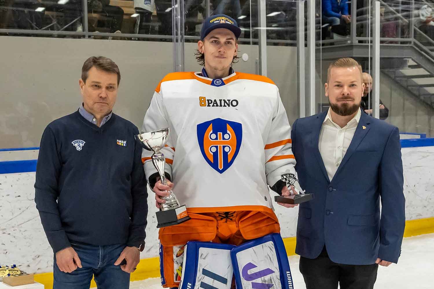 Tampereen Tapparan maalivahti Paavo Kohonen palkittiin U20 SM-sarjan pudotuspelien arvokkaimman pelaajan Ville Peltonen -palkinnolla.