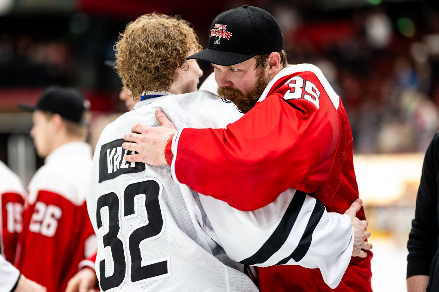 Leijonat.fi:n kuvaaja Riku Laukkanen taltioi maalivahtien kohtaamisen mitaliseremonioiden yhteydessä. Kuvat kertovat maalivahtien kunnioituksesta toisiaan kohtaan.