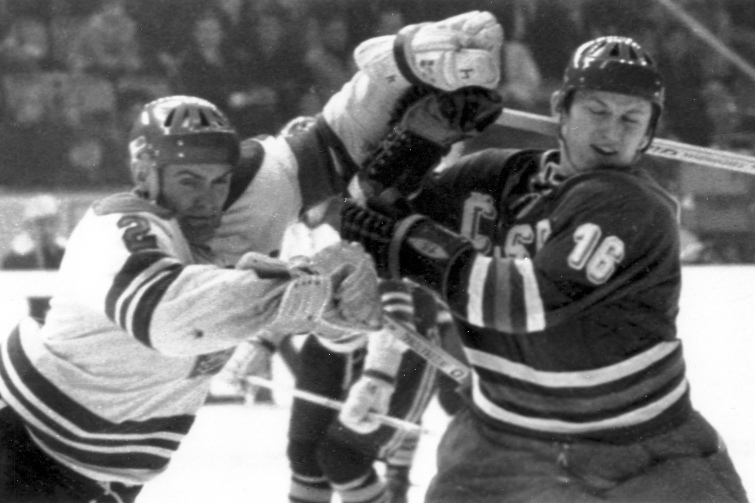 Seppo Lindström otti yhteen tshekkipelaajan kanssa vuoden 1970 MM-kisoissa Tukholmassa.